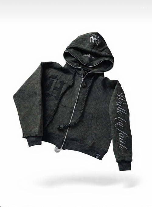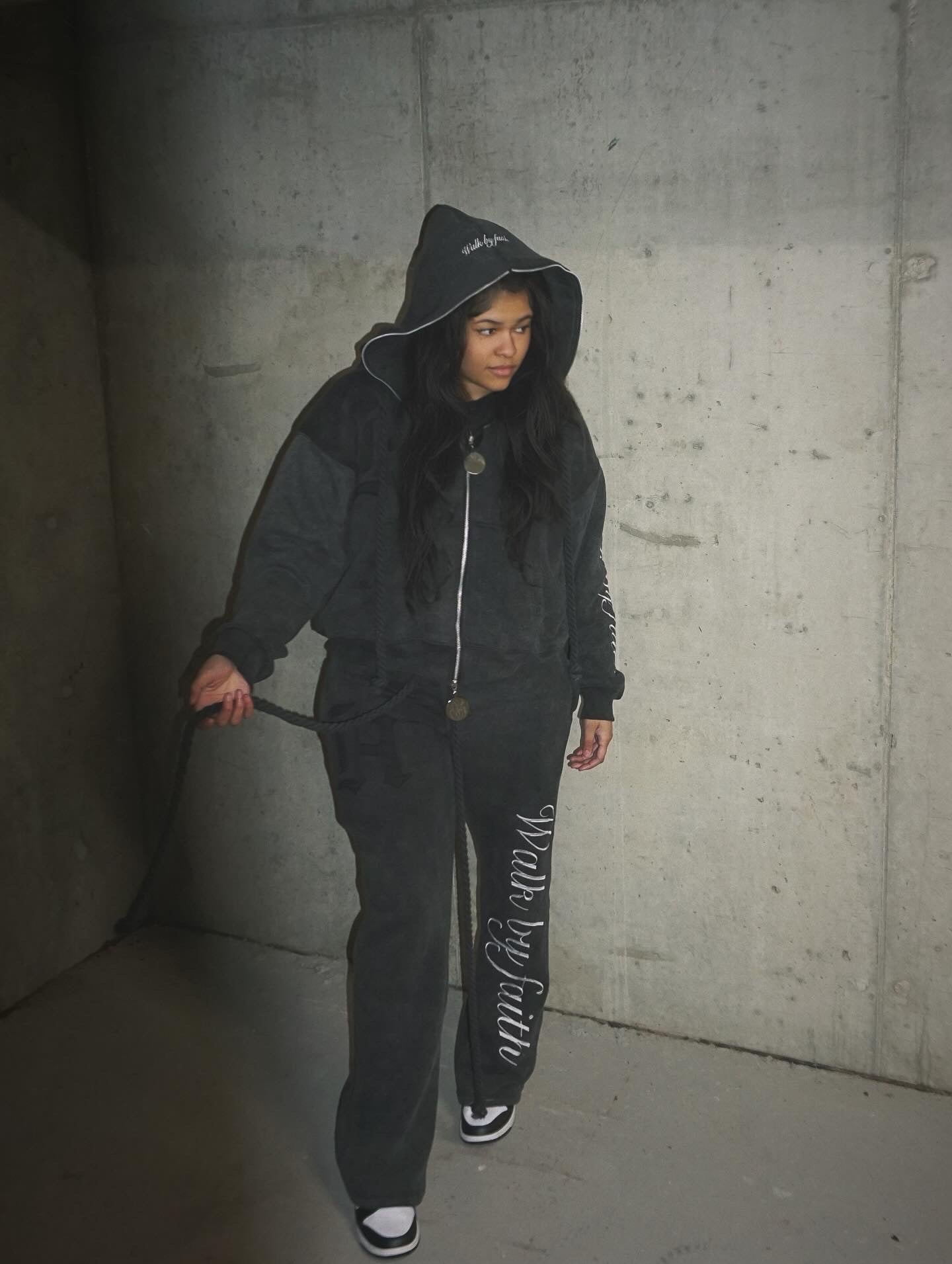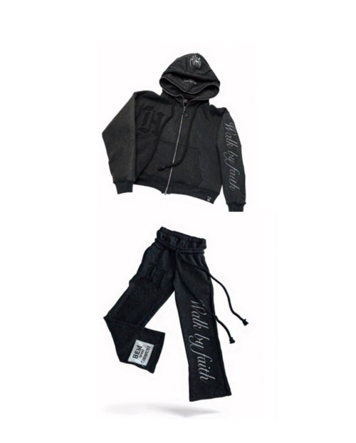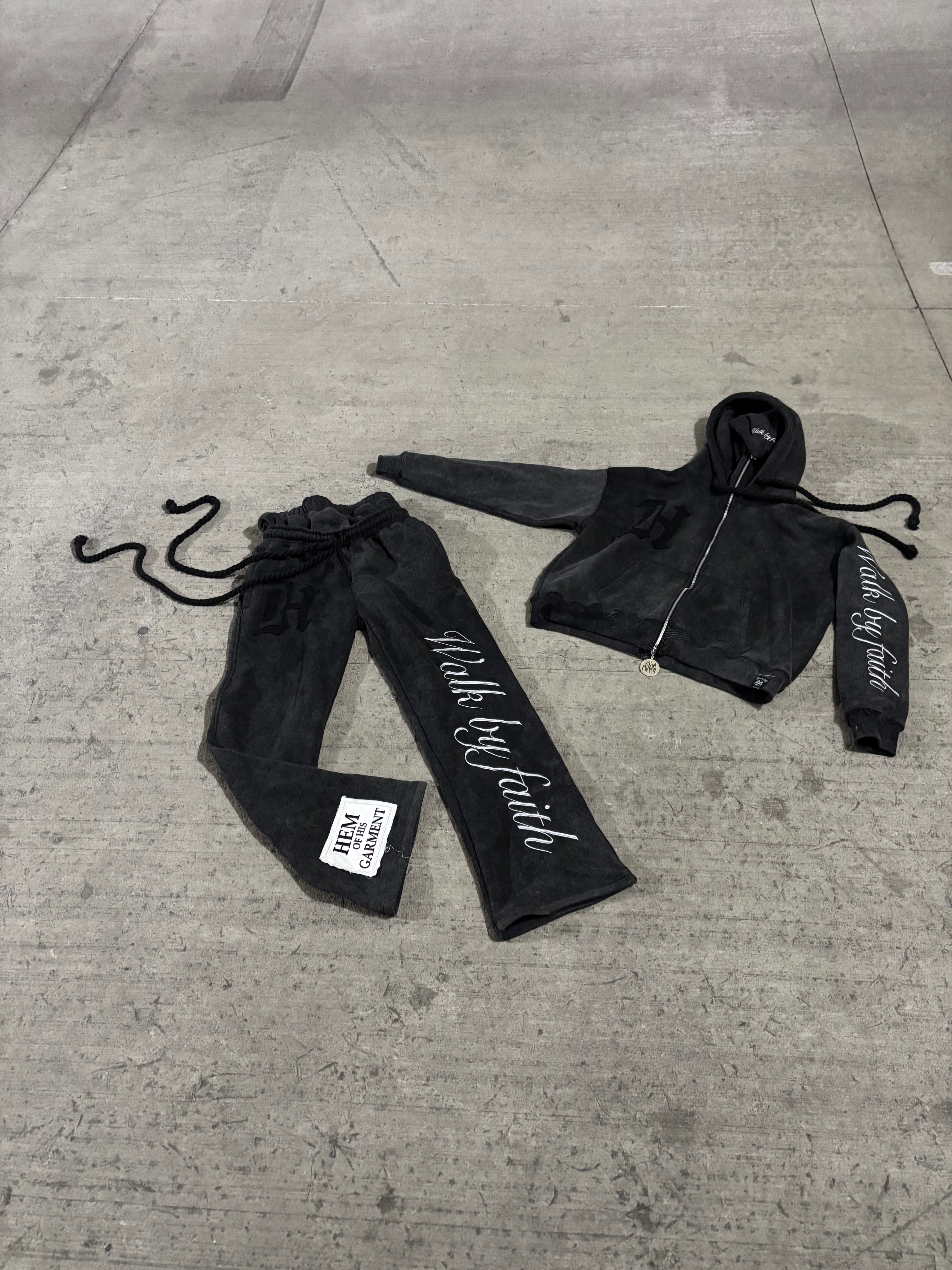 Double hood, double zipper, custom zipper hardware, full embroidery, full zipper, double waist pants oversized rope drawstrings set!
