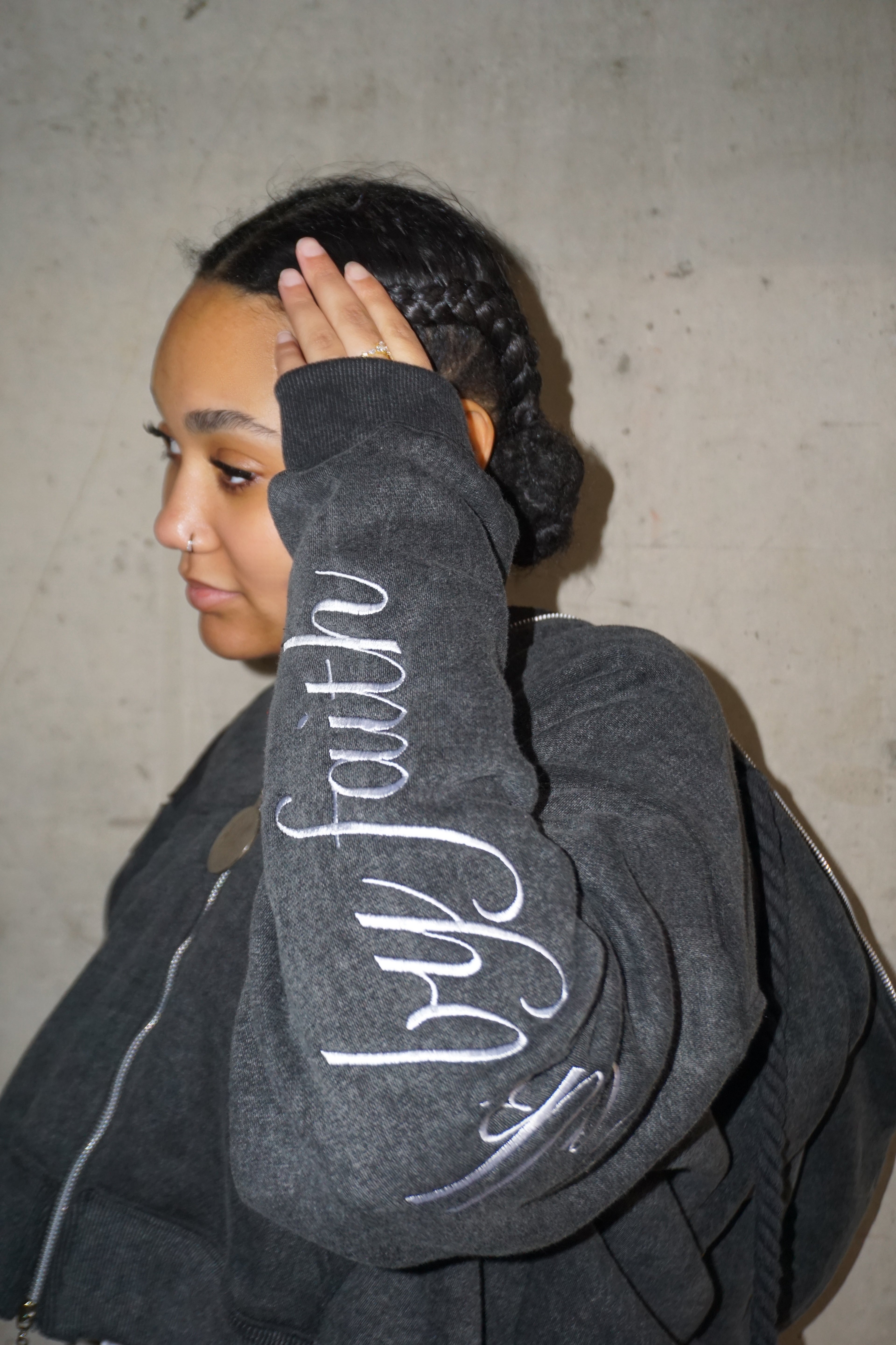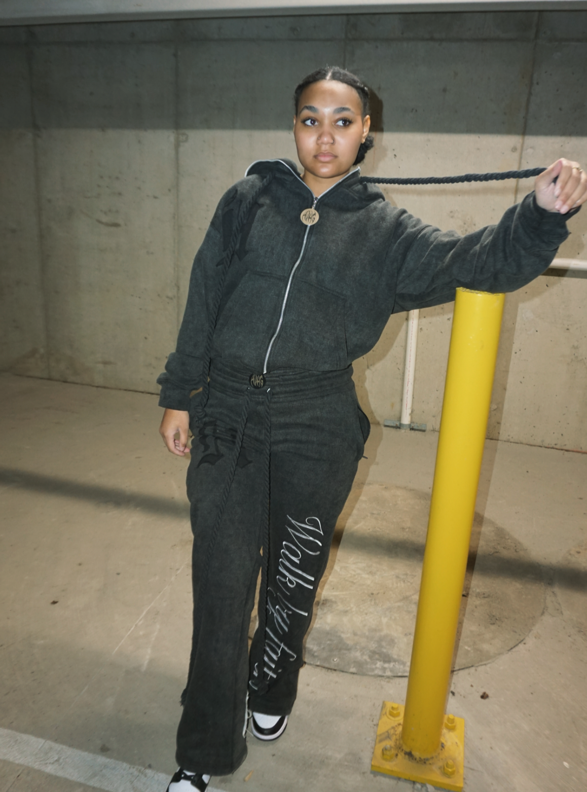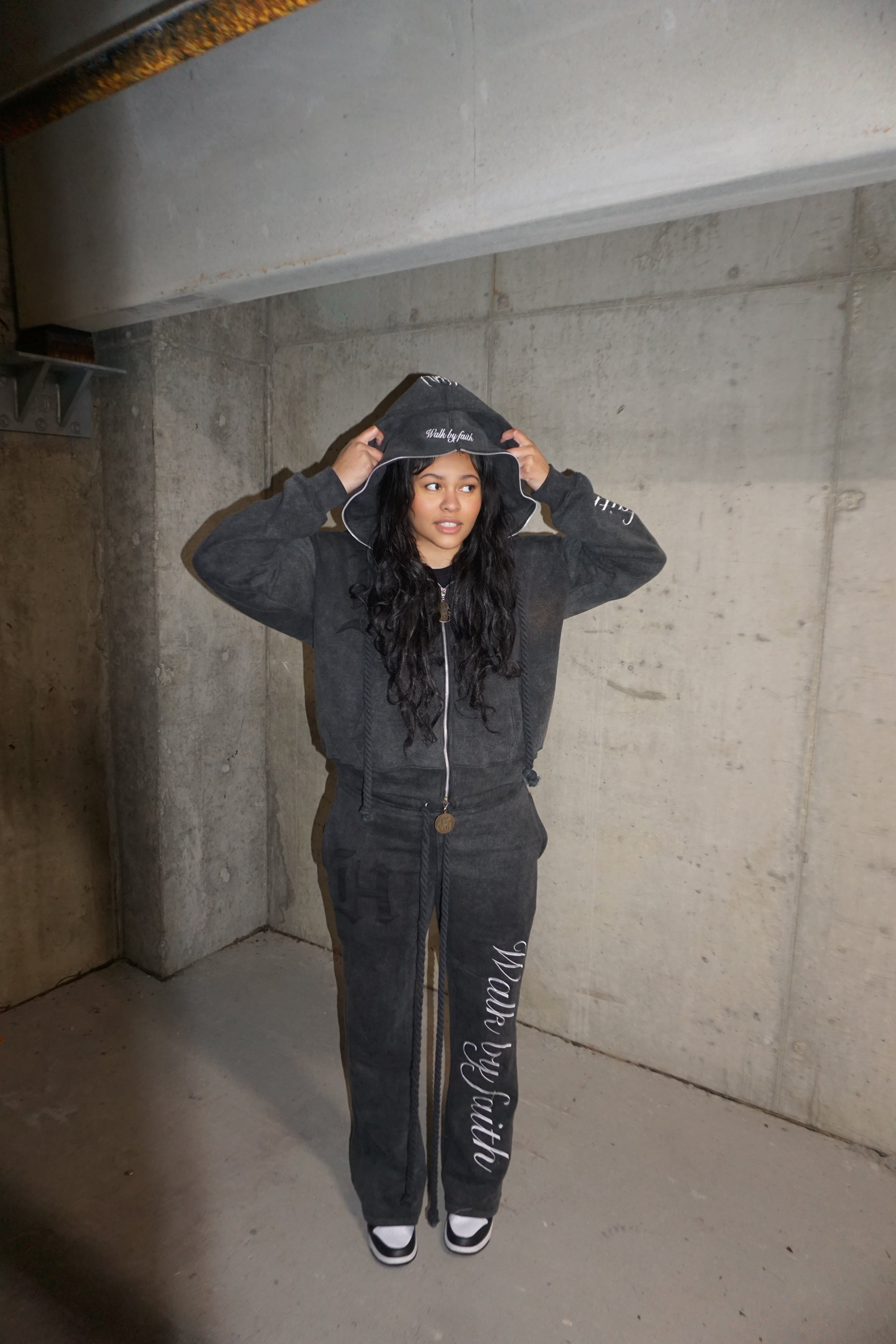Double hood, double zipper, custom zipper hardware, full embroidery, full zipper, double waist pants oversized rope drawstrings set!